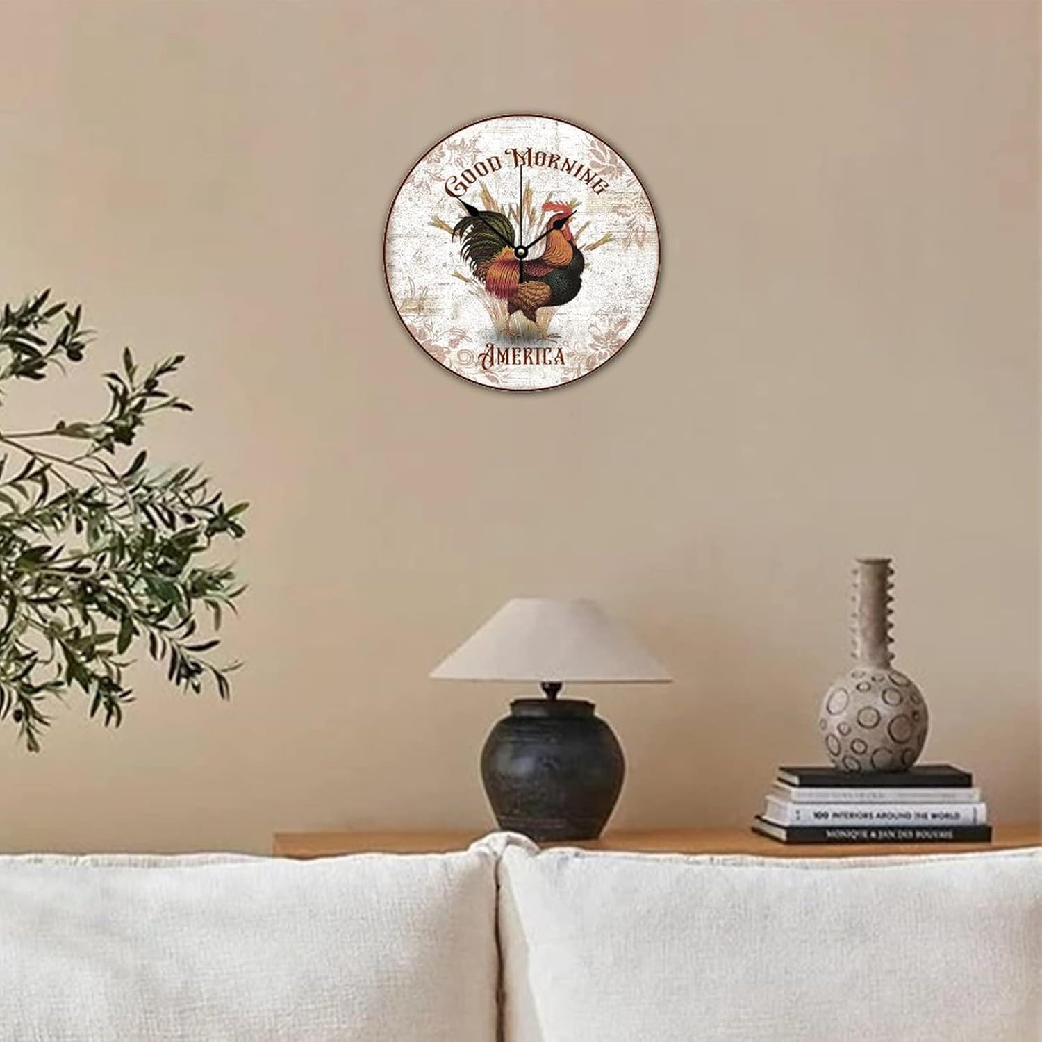 WengBeauty Rooster-Good Morning America Clocks Farm Bird Rooster Wooden Round Clock Rustic Rooster Gifts for Rooster Lovers Quality Quartz Battery Operated Home Decor for Kitchen 15×15 inches