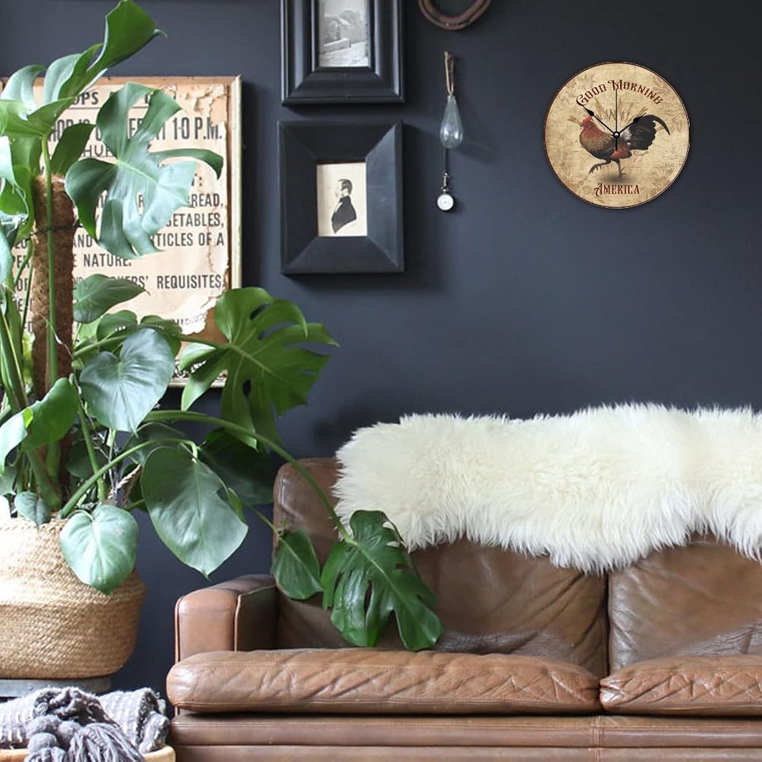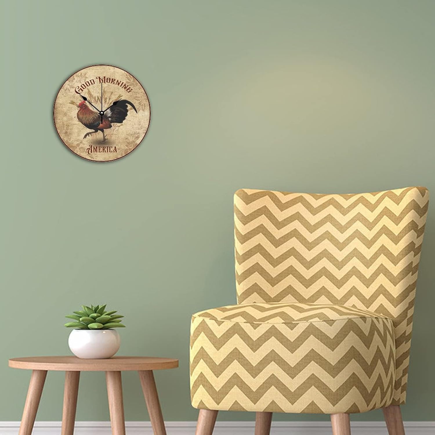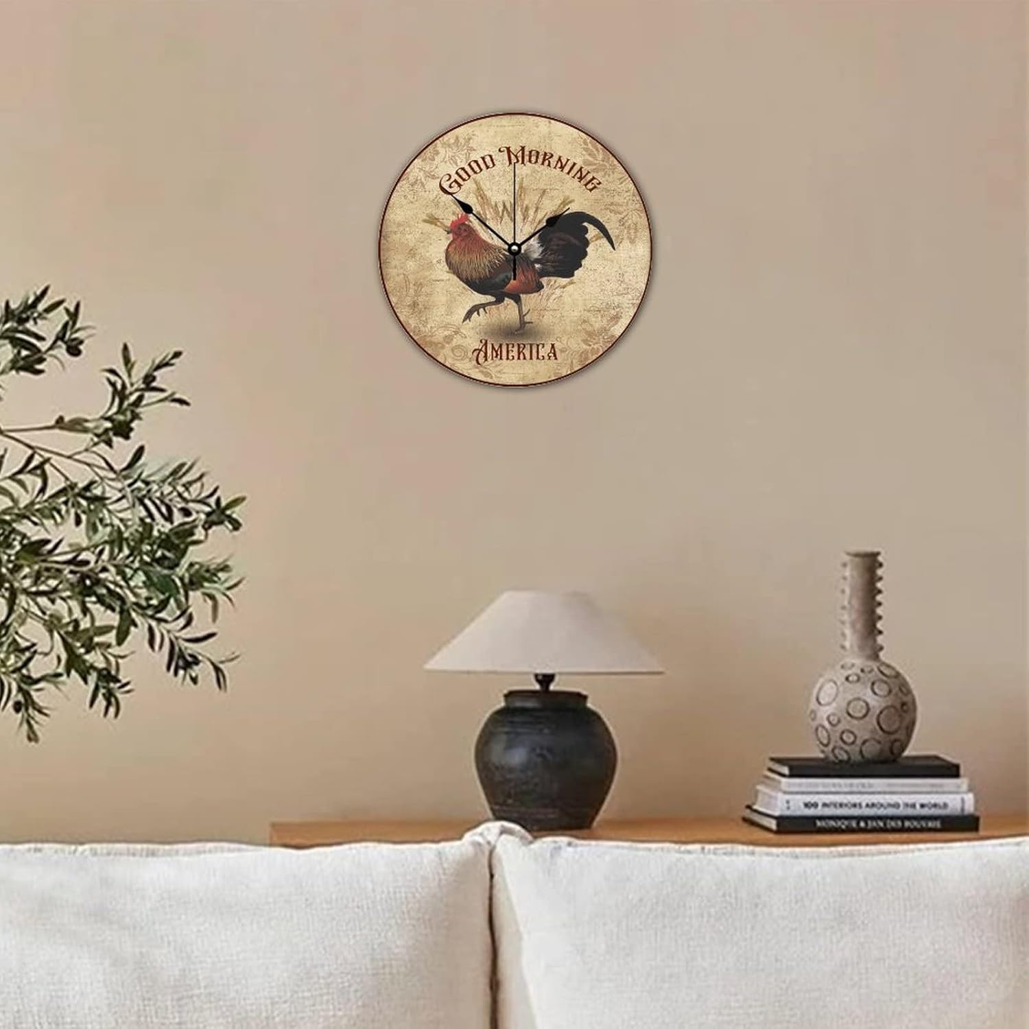 WengBeauty Rooster-Good Morning America Wall Clock Morning Rooster Wooden Round Clock Rustic Gifts for Animal Lovers Quality Quartz Battery Operated for Home Bathroom Bedroom 15×15 inches